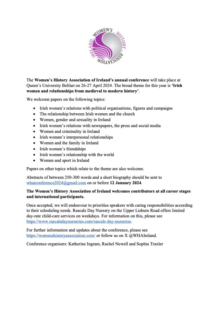 We are delighted this afternoon to announced the CFP for the 36th annual WHAI conference 2026. The conference will be held at Mary I Limerick on 29 & 30 May 2026. Closing dates for submissions on the theme of ‘Gain’ is 31 Jan. 2026.